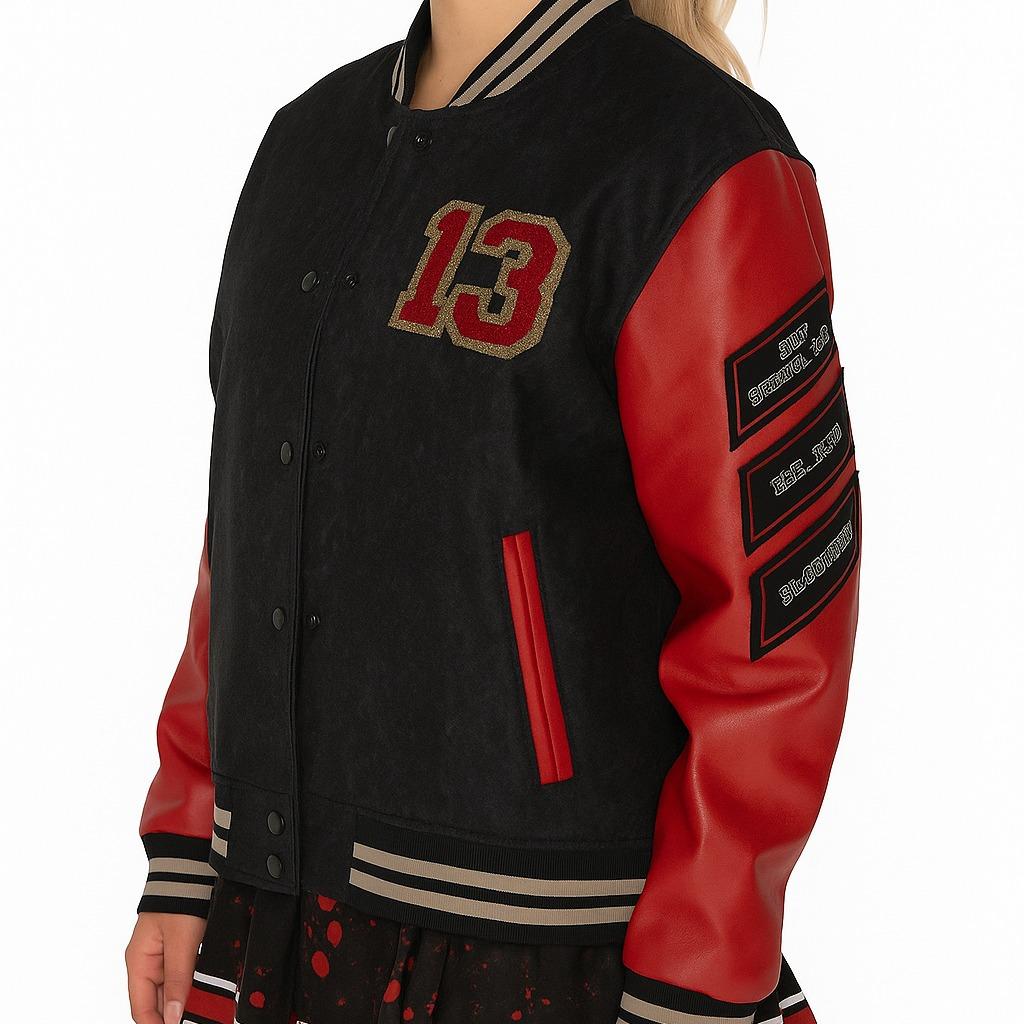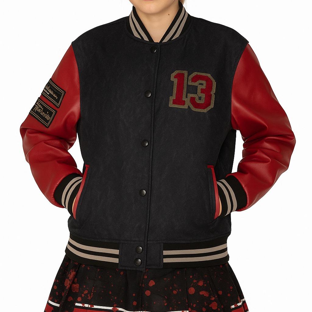 Design Highlights: This varsity jacket features a horror theme with red sleeves and a prominent Number 13 design. Perfect for women who love a bold, themed look. 🌟