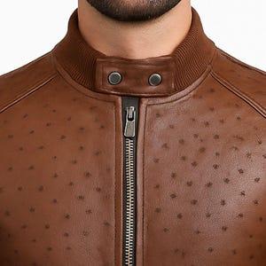 This Men’s Brown Ostrich Print Leather Bomber Jacket is a must-have for anyone looking for a durable, classic, and stylish biker-style jacket. 🌟