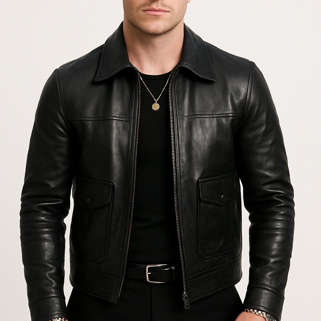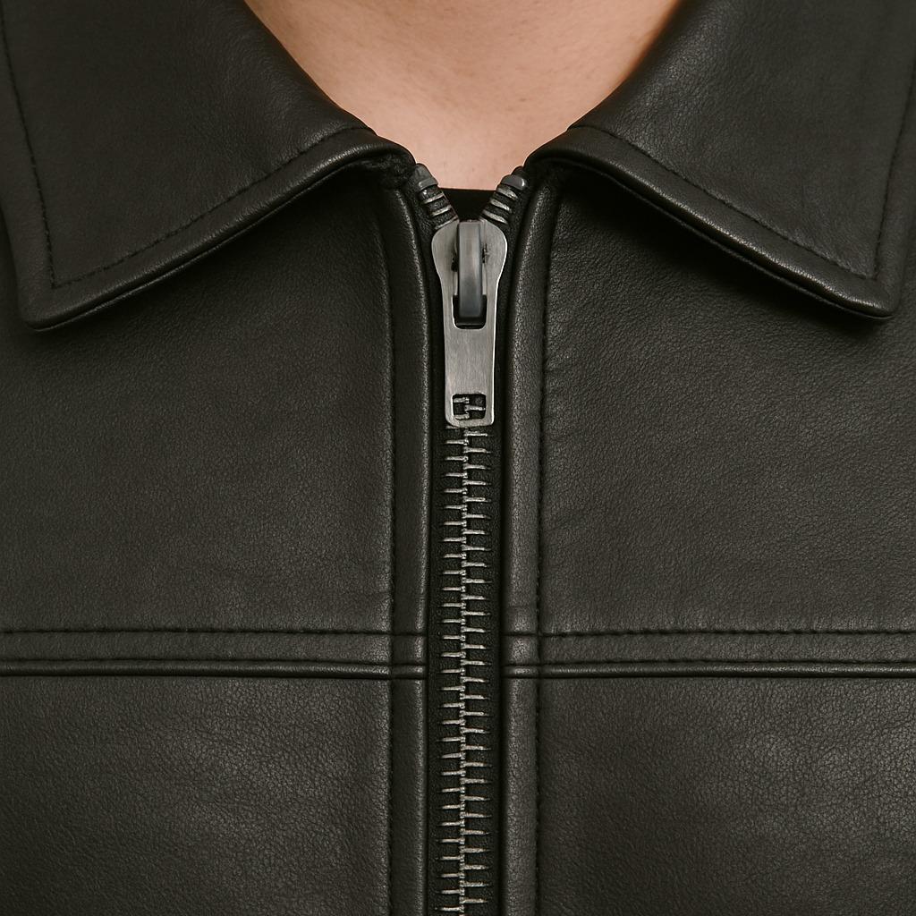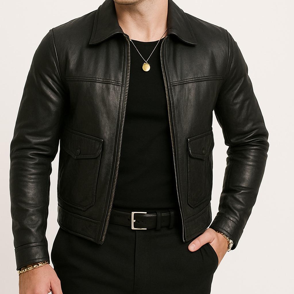 Rugged and Refined: Classic shirt collar meets sleek leather for the perfect modern-vintage vibe.