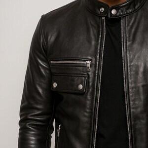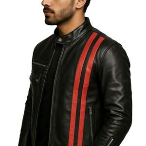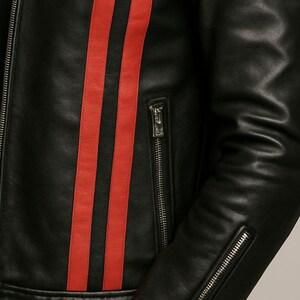 Elevate your riding style with this Men’s Black Leather Biker Jacket. It features striking red racing stripes that add a bold touch to your look. The jacket is equipped with zipper pockets, perfect for keeping essentials secure. Ideal for stylish riders who demand both style and functionality.