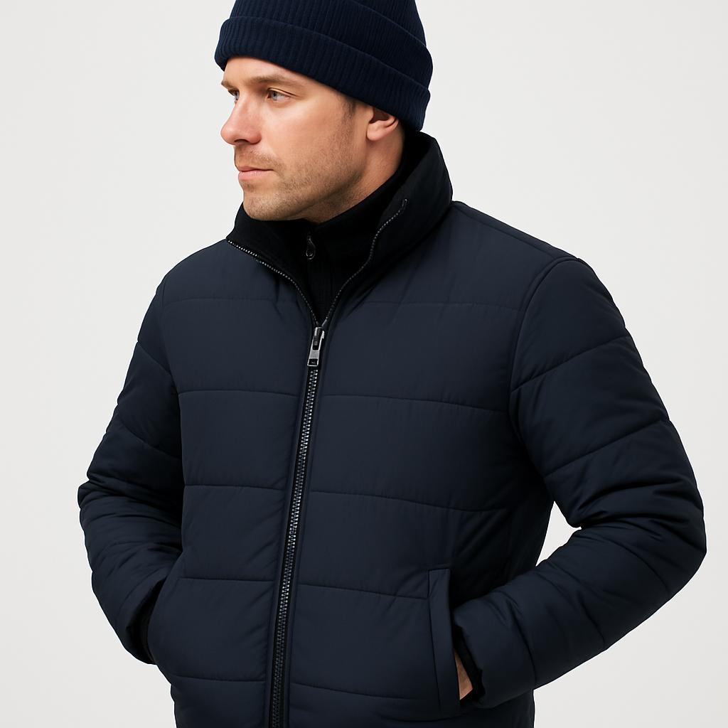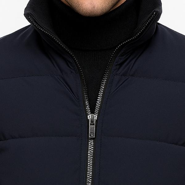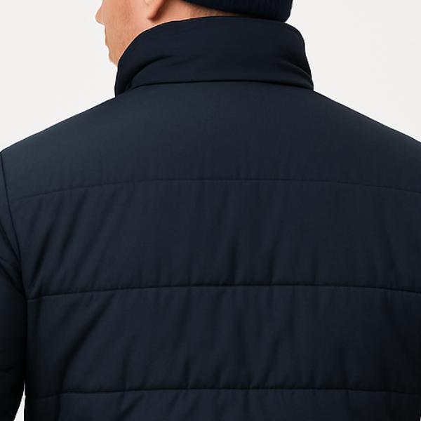 Men_s Lightweight Insulated Puffer Jacket Navy Blue Stand Collar Full-Length Zipper Hand Pockets Cold Weather Versatility All Seasons