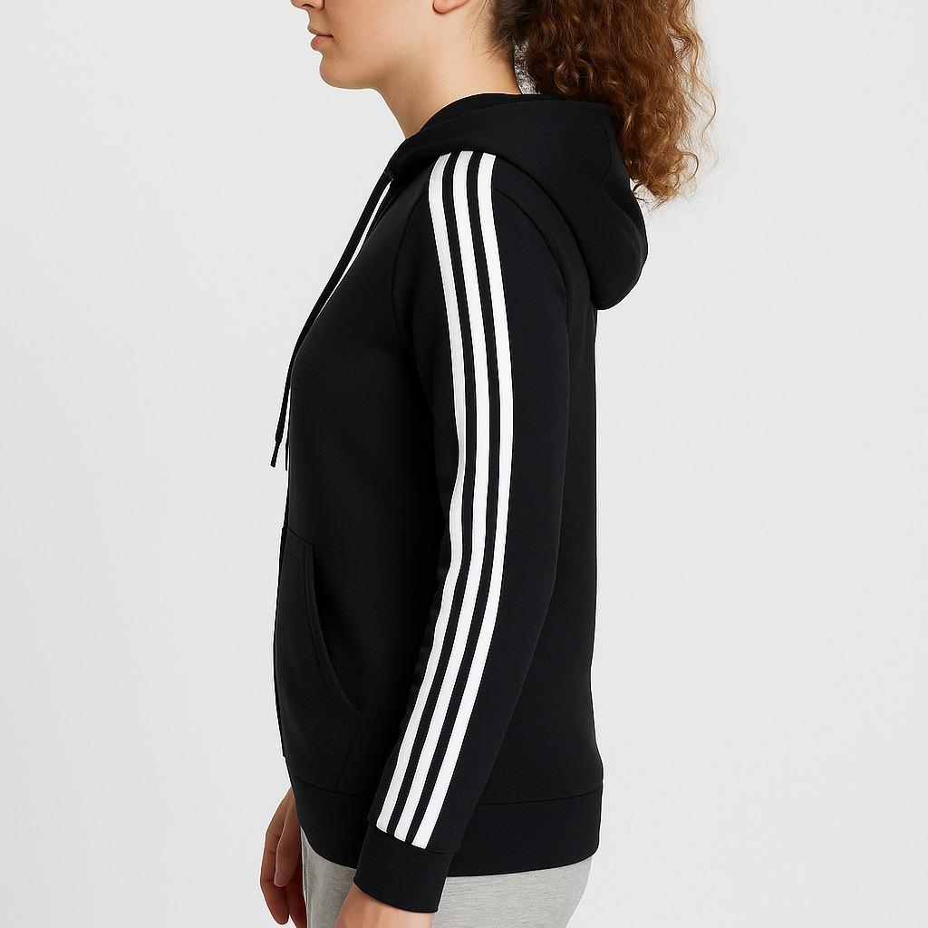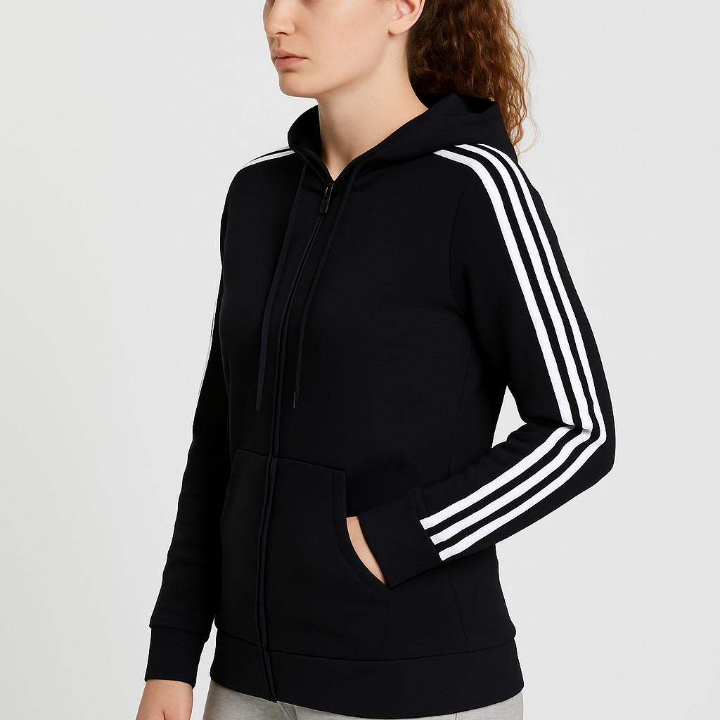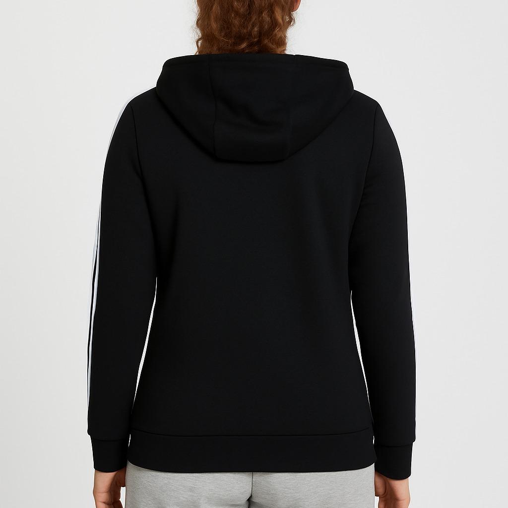 The hoodie combines style with comfort, making it ideal for casual wear. The white stripes add a touch of contrast to the black fleece. It is perfect for women who value both style and comfort in their clothing.